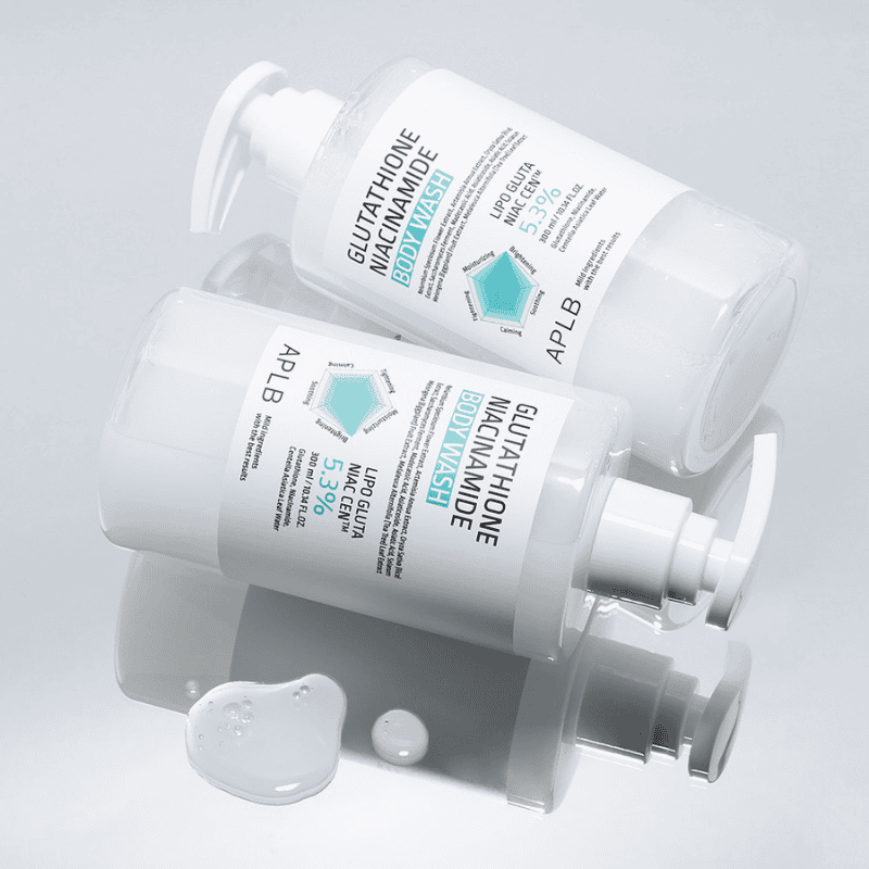 APLB Glutathione Niacinamide Body Wash – švelnus kūno prausiklis su glutatijonu ir niacinamidu, drėkinantis, skaistinantis ir suteikiantis subtilų odos švytėjimą.