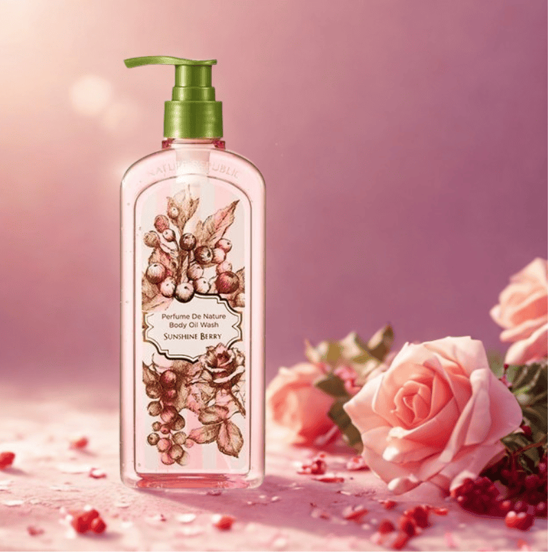 Nature Republic Perfume De Nature Body Oil Wash – prabangūs kūno prausikliai su aliejais ir unikalios parfumerijos aromatais (345 ml)