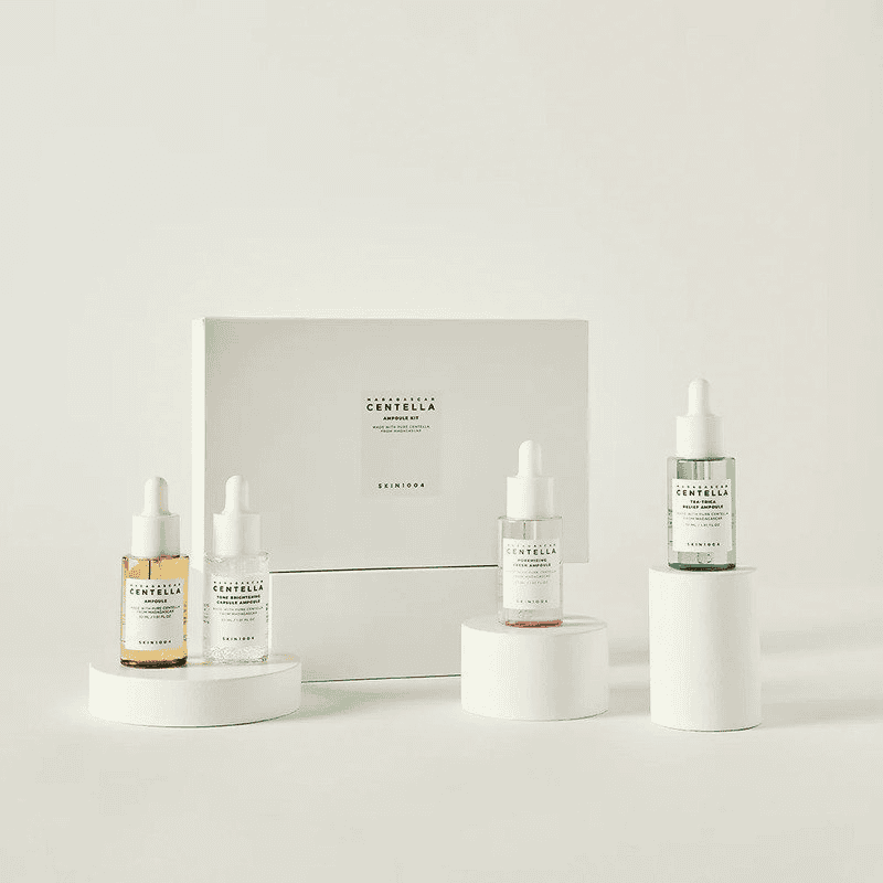 Skin1004 Madagascar Centella Ampoule Kit – 4 raminančių ampulių rinkinys su Centella Asiatica, skirtas jautriai ir probleminei odai.