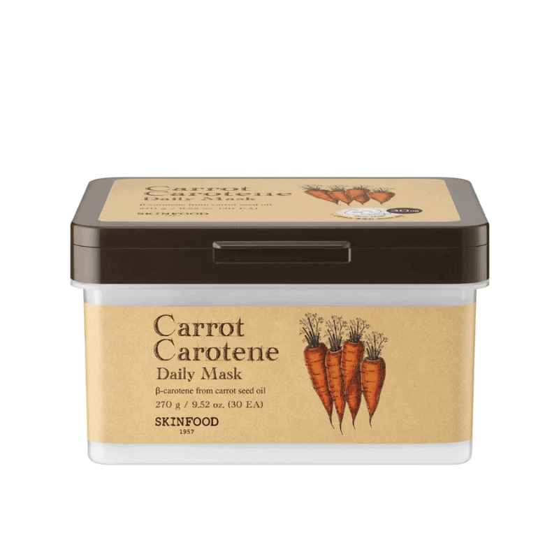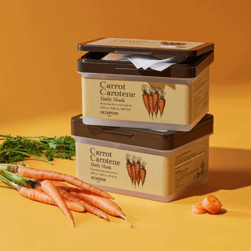 SKINFOOD Carrot Carotene Daily Mask – kasdienė veido kaukė su morkų ekstraktu ir karotinu. Drėkina, ramina, maitina ir suteikia odai sveiką spindesį.