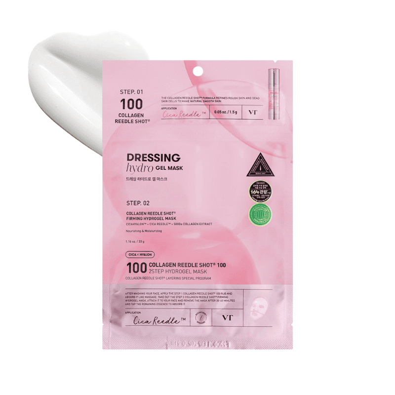 VT Collagen Reedle Shot 100 – dviejų žingsnių hidrogelio kaukė, suteikianti stangrumo, putlumo ir glotnumo. Intensyviai atkuria ir drėkina odą.
