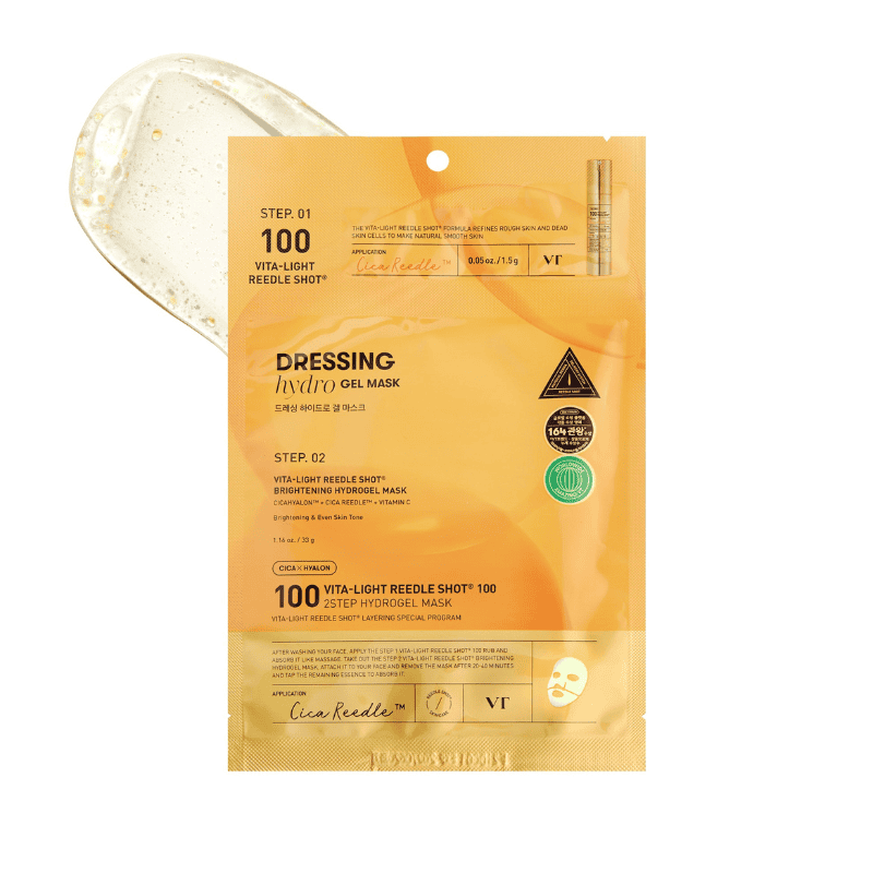 VT Cosmetics Vita-Light Reedle Shot 100 2-Step Mask – dviejų etapų hidrogelio kaukė, kuri šviesina, drėkina ir atgaivina odą su niacinamidu, vitaminu C ir CICA kompleksu.